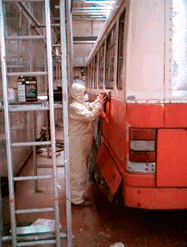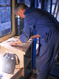 “LEFT Here on the afternoon of Thursday June 11th, John Bashforth applying undercoat to Computerbus...