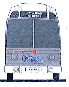 ABOVE: low-resolution .gifs showing the original design supplied by The Creative Studio. The side view (not shown here) was transferred to photocopied acetate sheets, then projected on an overhead projector onto full size strips of wallpaper stuck to the paintshop wall. The image was then traced with charcoal, before the sheets were taped to the side of the bus for the image to be transferred. The outline was then painted in. Such was the technology of the day... Nowadays, the whole job would have been output direct from a computer to a vinyl cutter.