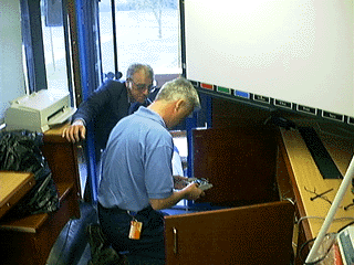 This view taken on Spetember 11th 1998 - the day of the official launch - shows Freddie putting the finishing touches to the patch cupboard and associated 24 port computer switch installed at that time.