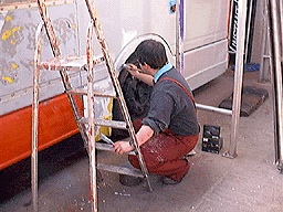 The new aluminium panels are being glued and riveted to the bodywork.