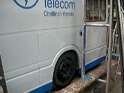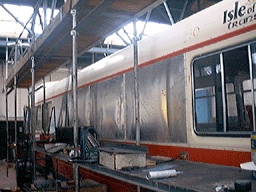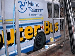 Significant re-panelling will be necessary before the vehicle is repainted into the bright, colourful livery designed for Manx Telecom by Des Clague of the Creative Studio.
