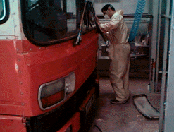Preparation is all, and here air-powered mechanical disk sanders are being used to get the surface ready for painting.