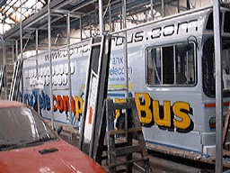 “LEFT: For added security and prior to the application of an all-over advertising livery, the offside windows of Computer Bus are being panelled over.