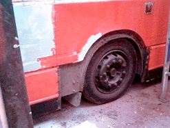 “LEFT The attempt to repair the side panels has been abandoned and instead, replacements have been fitted. The yellow/gray panels are from sister bus 33 (MAN 33N) which has donated several parts to Computerbus, whilst the white panel is a new glass fibre replacement...”