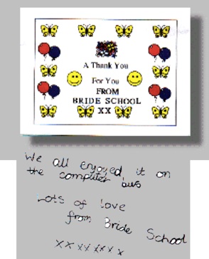 “Variety is one of the most appealing aspects of working on the Computer Bus. One day we can be outside a town-centre school on the side of a busy street, the next day we can be located in an idyllic playground, surrounded by beautiful scenery! We may be doing paint graphics with reception children, twenty four hours later with sixth formers working on A-level art projects as happened recently at Castle Rushen High School.”